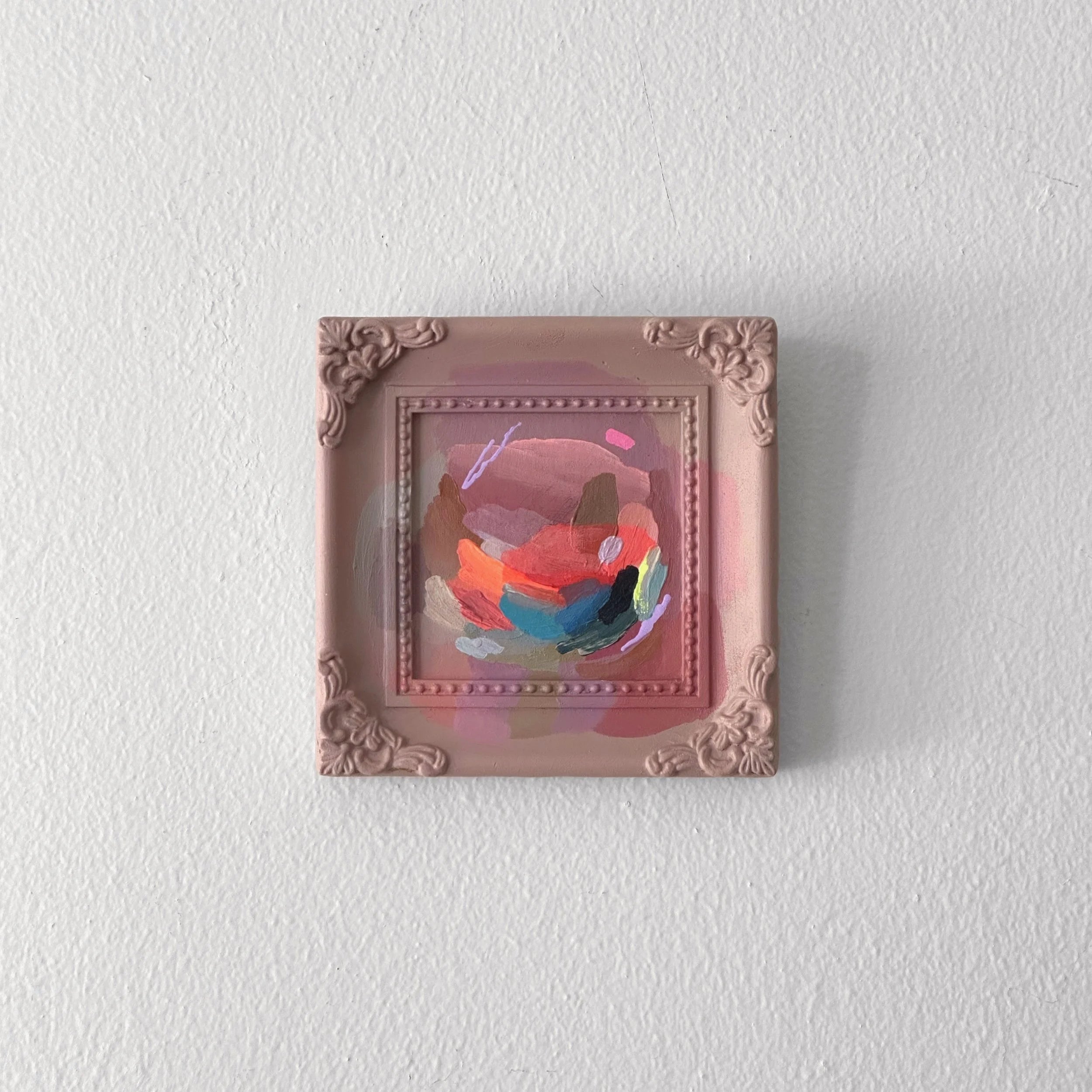 Acrylic and marker on mixed media art board and 4.25×4.25” frame. Shipping and insurance added on next steps.