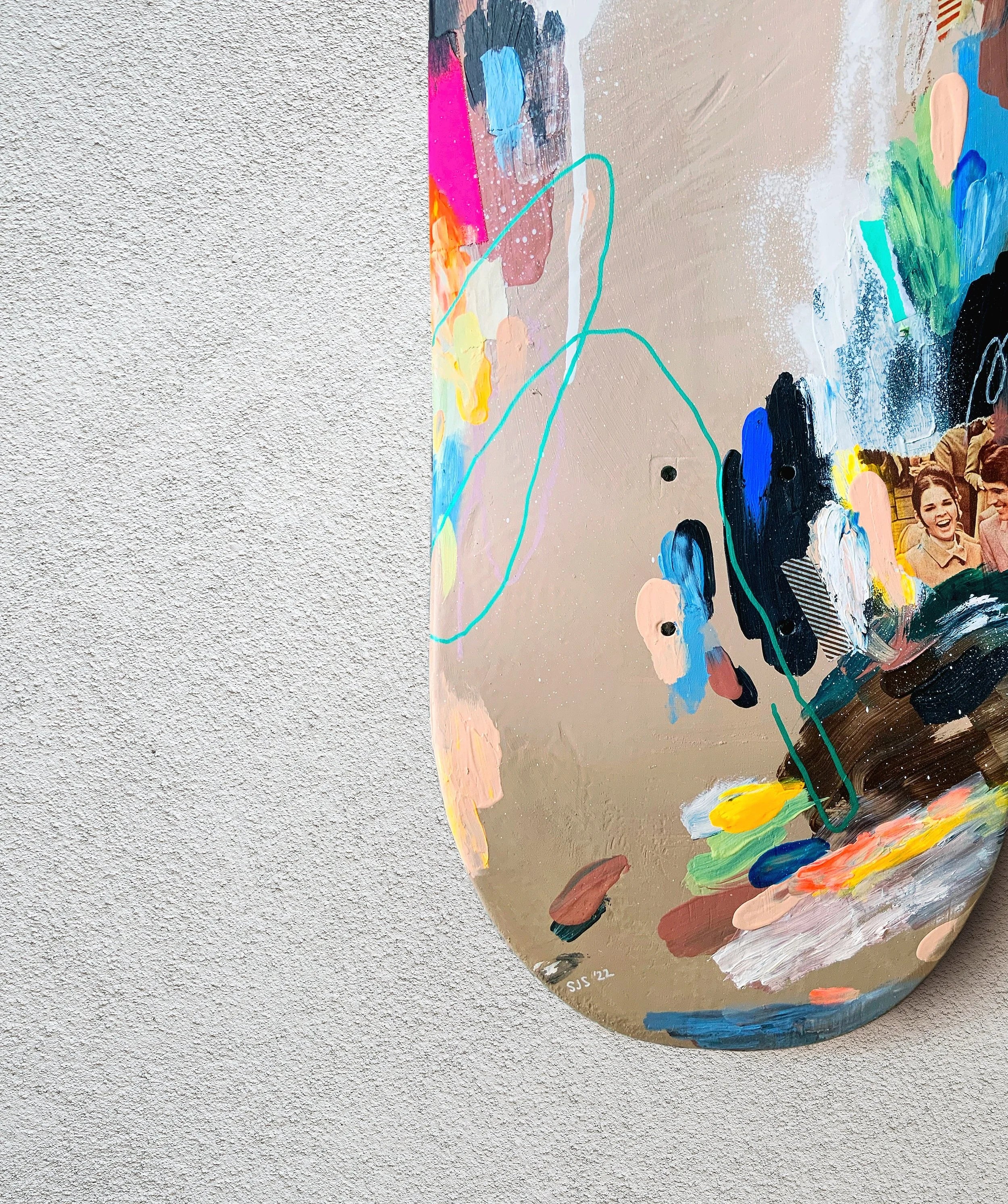 Acrylic, magazine, spray paint, and marker on a vertically-oriented skateboard. 31”L x 8.5”W x 1.75”D. Ready to be hung, no assembly required.