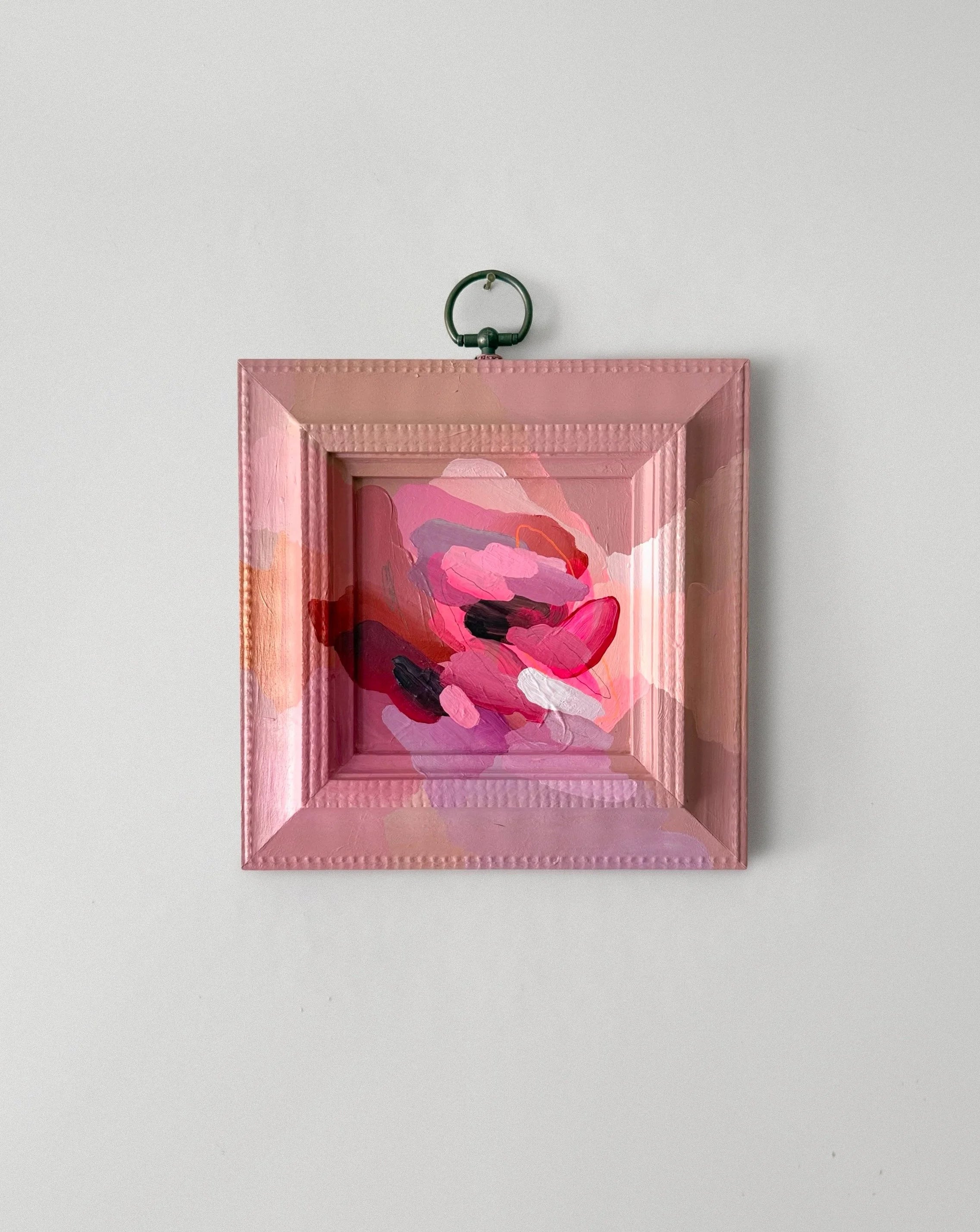 Pink Lady No. 1 is a fun and energetic piece with vintage hanging system. Overall dimensions are 6.5×7.75. Materials include acrylics and pencil on art board and wooden frame. Shipping and insurance added on next steps.