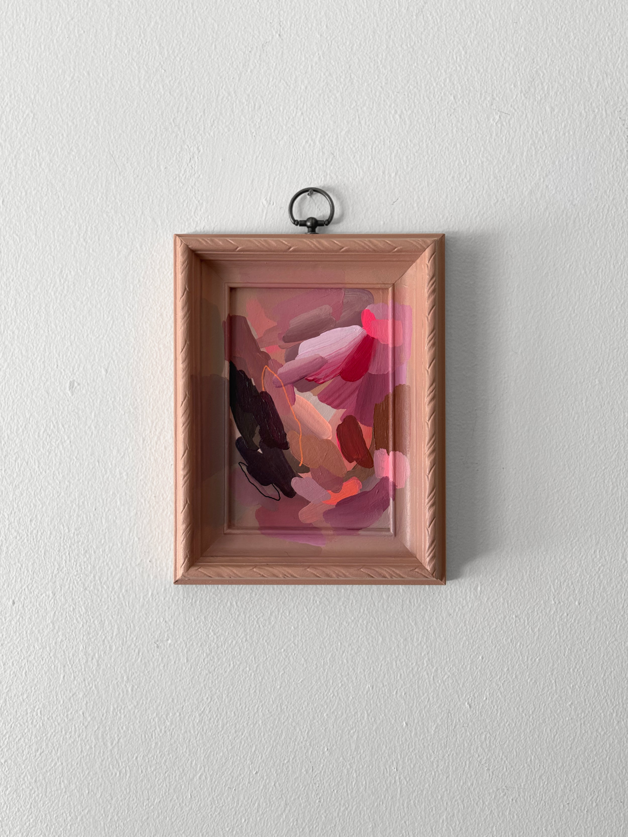 A vintage frame and hanging system. Overall dimensions are 7×10”. Materials include acrylics on art board and wooden frame. Shipping and insurance added on next steps.
