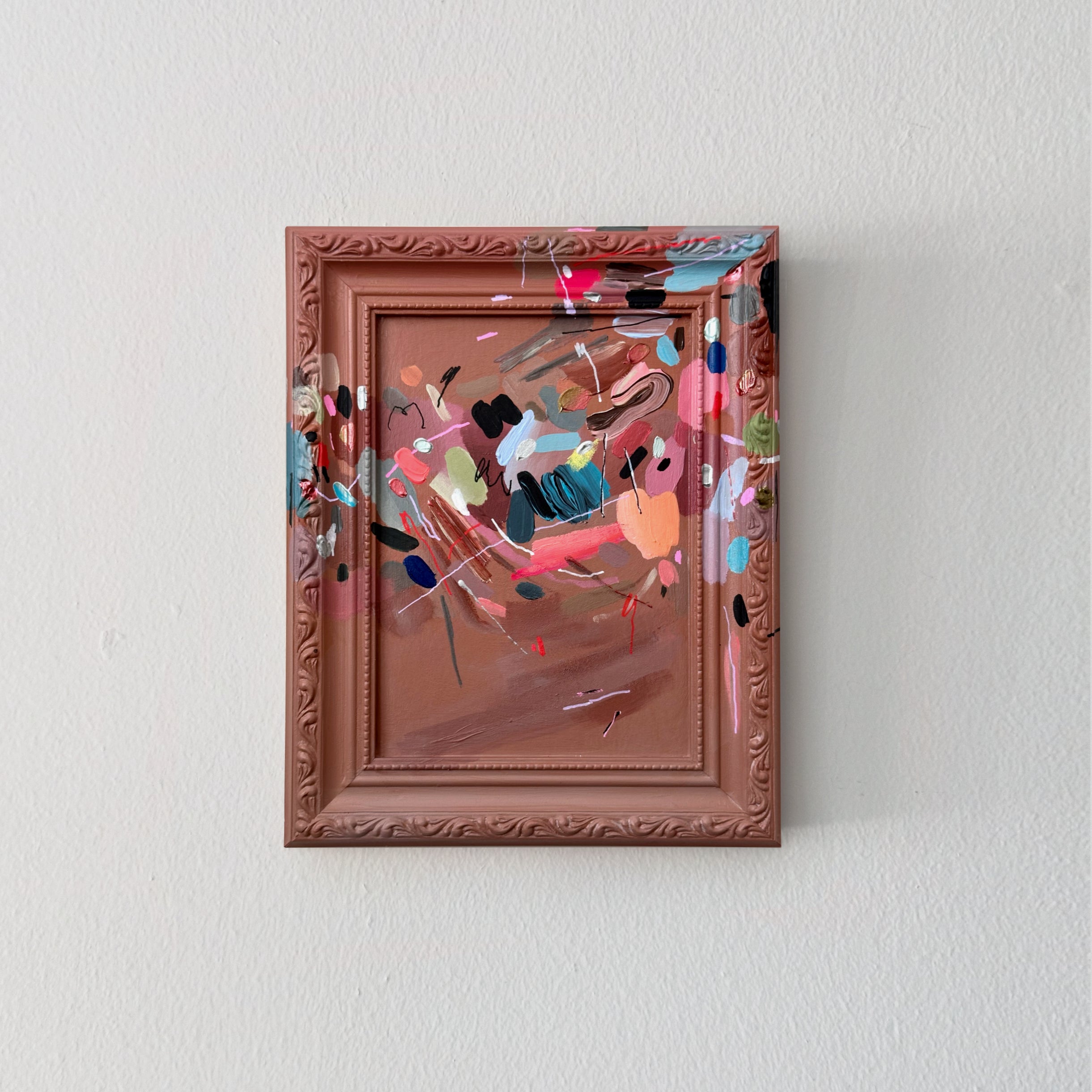 Acrylic on art board and resin frame. Overall dimensions are 7.25×9.25”.