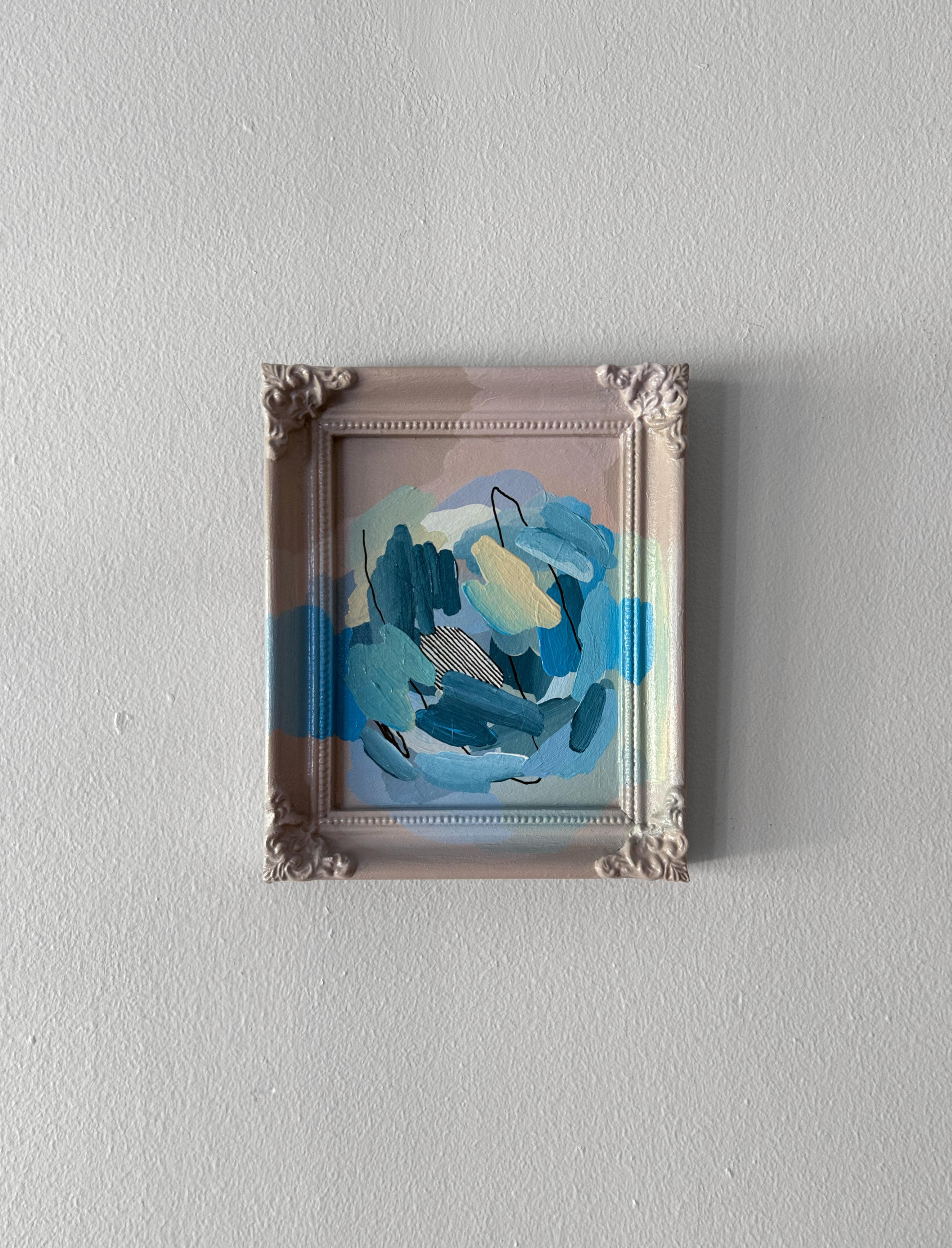 Calm and cool, yet fun and flirty on a vintage frame. Overall dimensions are 5.25×6.25”. Materials include acrylics on art board and wooden frame. Shipping and insurance added on next steps.
