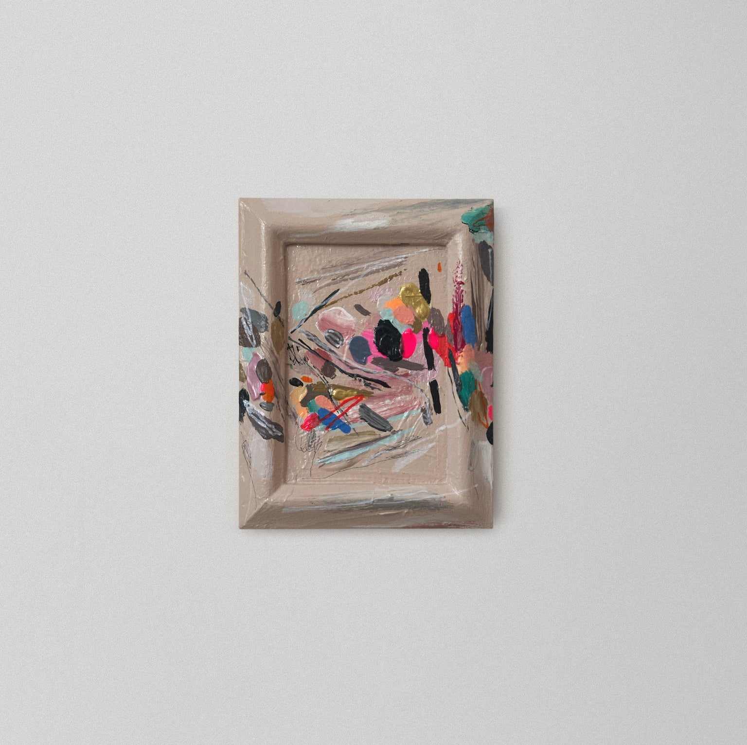 Acrylic and marker on mixed media art board and 3.25×4.25” frame. Shipping and insurance added on next steps.