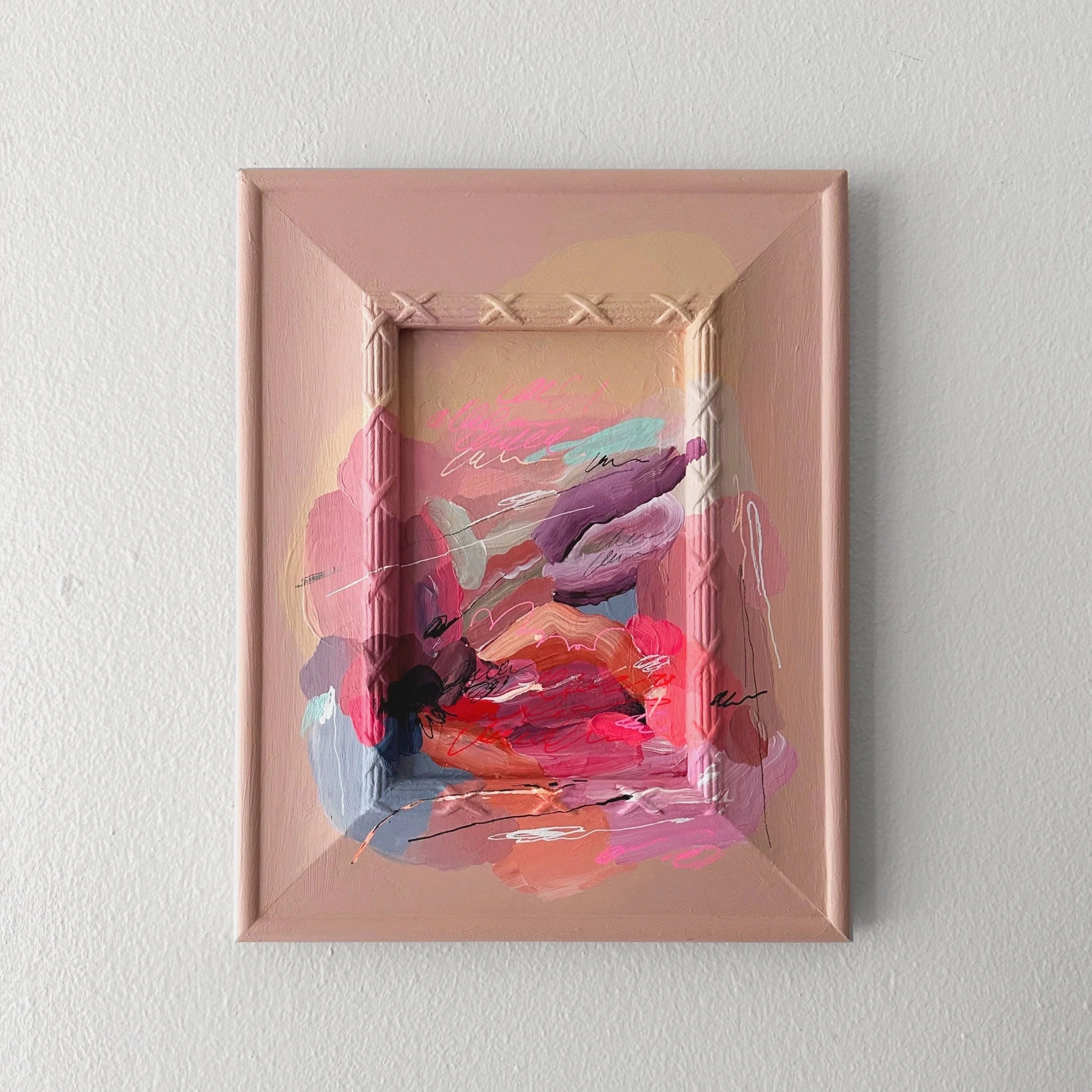 The X's on the design of this frame remind me of little love notes. It's acrylic and marker on a repurposed 7.5"x9.5" frame. Shipping added on next steps.