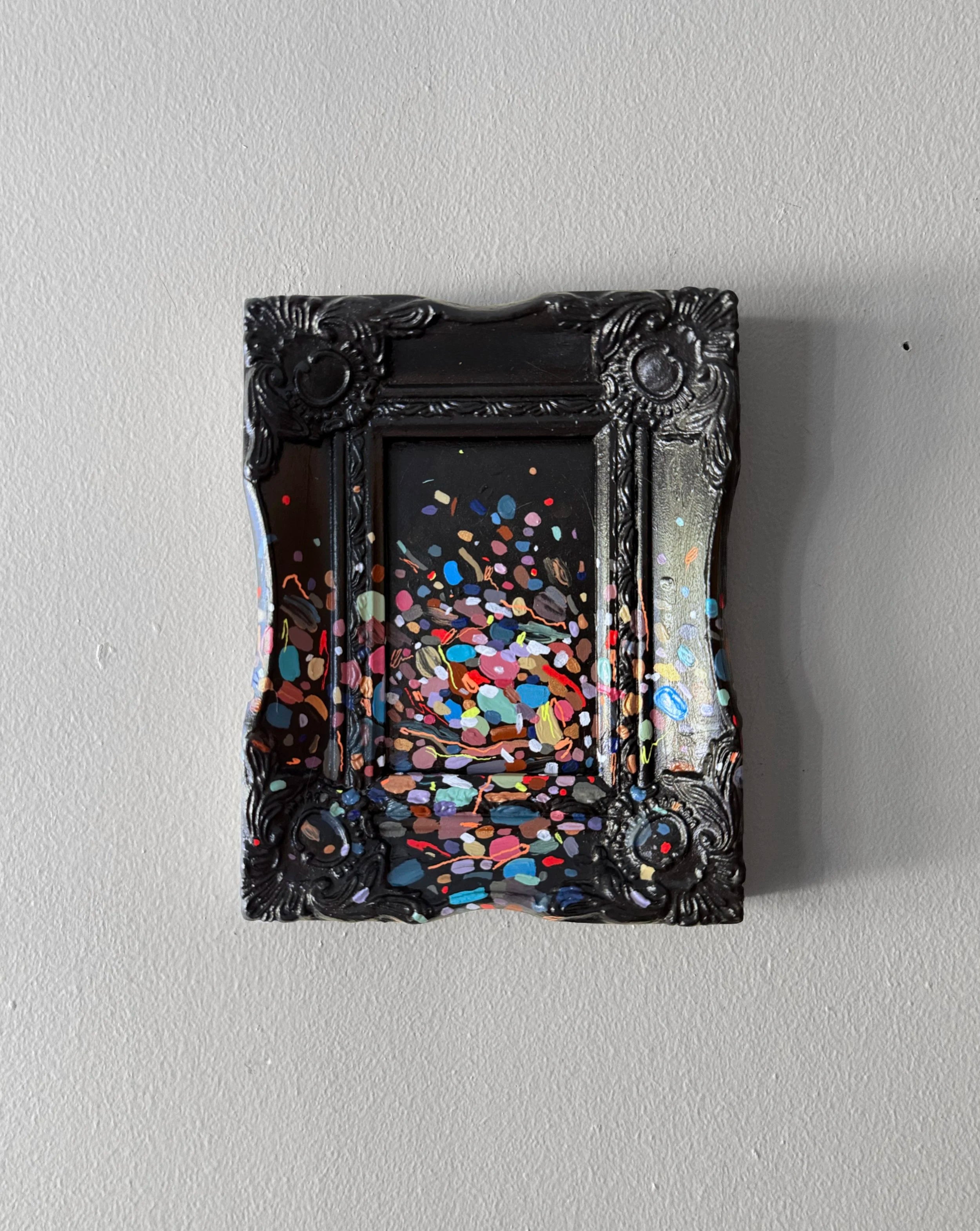 Neon on black — what a combination. Overall dimensions are 7.5×9.25” Materials include acrylics on art board and resin frame. Shipping and insurance added on next steps.